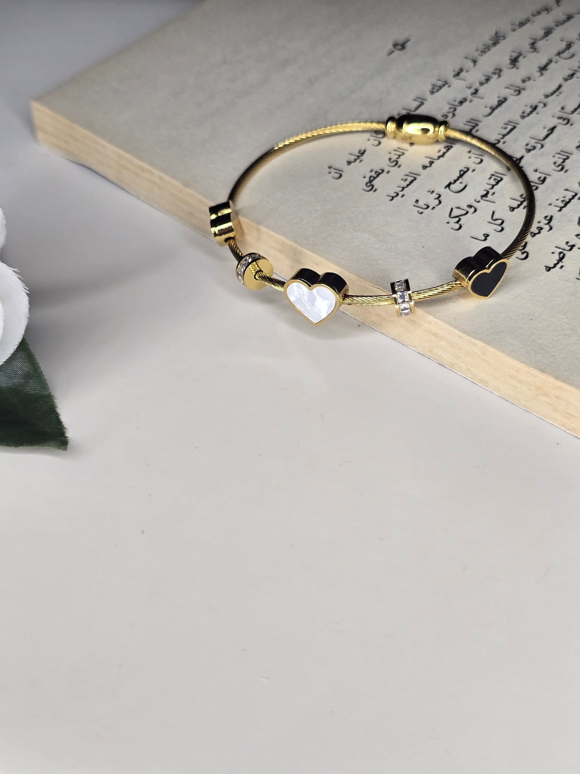Pandora Style Bracelet with Black & White Heart Charms – Gold Plated Stainless Steel