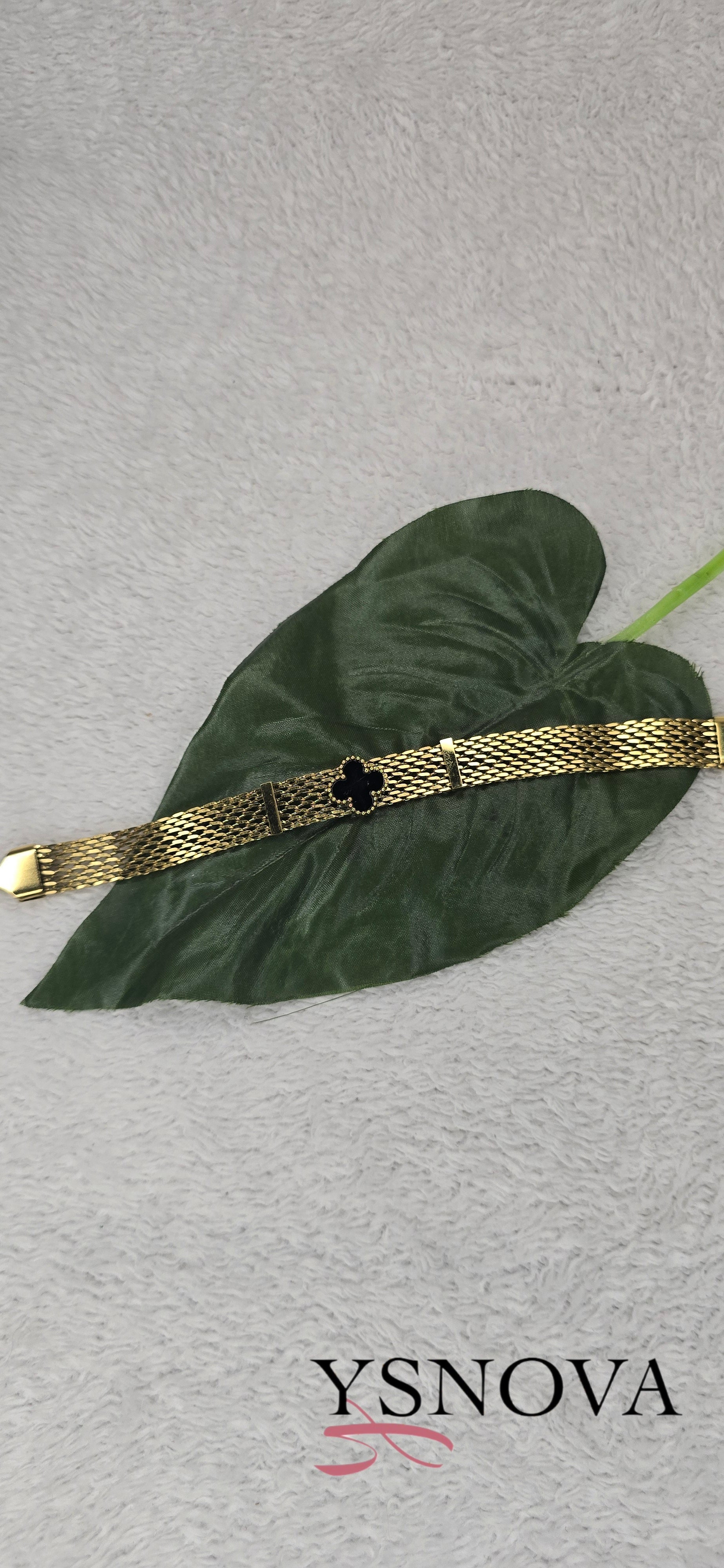 Elegant gold plated stainless steel bracelet featuring a bold wide design with a signature black clover stone inspired by Van Cleef’s iconic style. Combines classic charm with modern sophistication, perfect for daily wear or special occasions. A timeless and refined accessory that makes an elegant gift for stylish women.