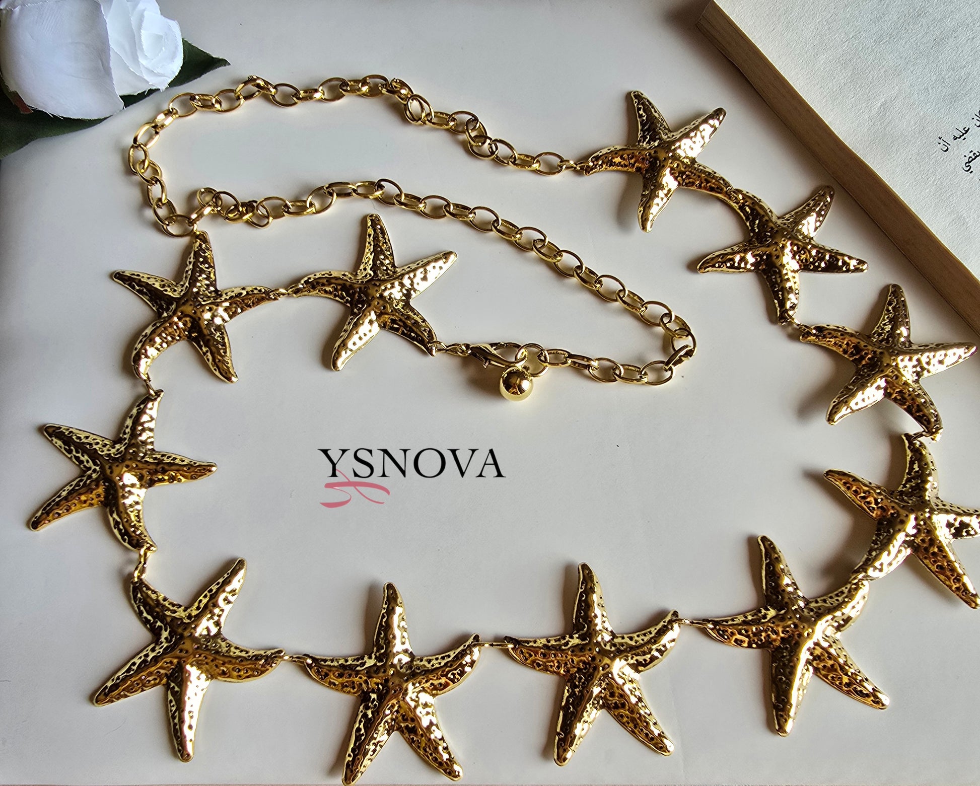 Elegant gold plated stainless steel belt featuring a connected starfish design that adds a stylish, summery charm to your look. Adjustable to fit all sizes, making it perfect for dresses, abayas, and summer outfits. A unique accessory that blends elegance with a touch of seaside flair.