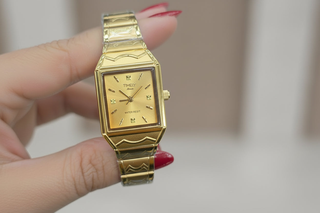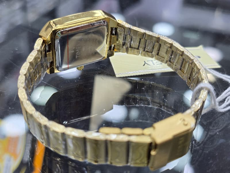 The watch in the image is a Timely brand women's watch, specifically a gold-tone model with a gold-colored dial and a metal bracelet. The dial features crystal hour markers .